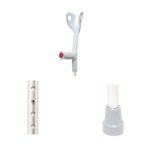 Color plata. Con reflectante . Codera fija. Mango de agarre PVC gris, con reflector en punta ajustable. Rango máximo de extensión desde la tomada de la mano al piso 102 Cms.  Rango minimo 80 Cms. Altura ajustable mediante 10 hoyo. Ajustable en altura por sistema de botones. Diámetros de tubo inferior