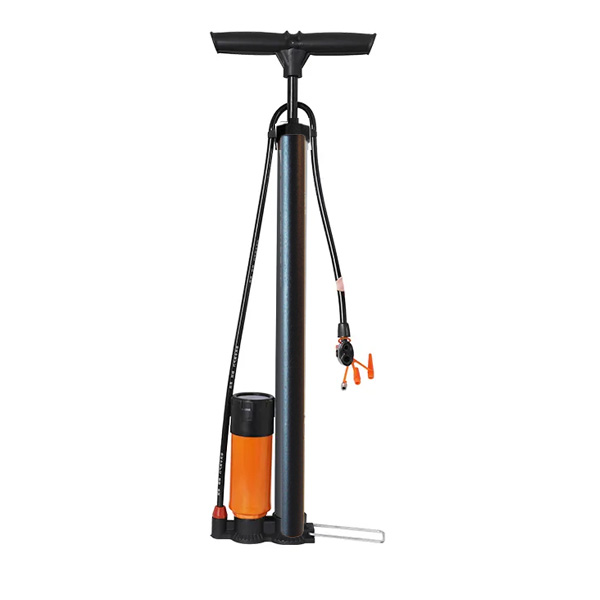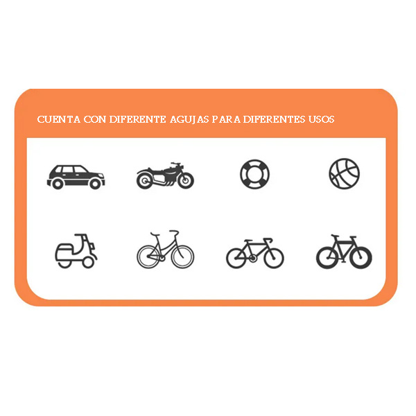 Diámetro de 38 mm. Largo de la bomba 51 cm. Altura 64 cm. Con acumulador para presión constante. Con marcador de presión hasta 160 psi. Sostenedor de pie lateral. Mango plástico. Adaptadores para distintos tipos de válvula.