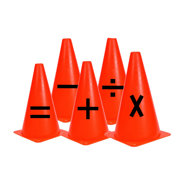 Consta de 5 unidades de cono de plástico inyectado de 30 cms. de altura. Con 5 diferentes operaciones matemáticas; suma, resta, división, multiplicación y signo igual.