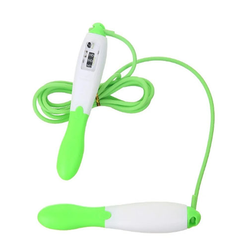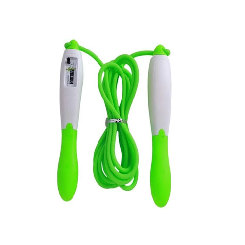 Cuerda para saltar, adultos y niños. Cuenta con un mango contador de saltos con botón de reseteo. Cuerda plástica trenzada de 2.7 metros.