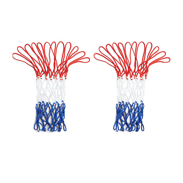 Par de redes para aro de básquetbol en diseño tricolor (rojo, blanco y azul), elaboradas en nylon trenzado de alta resistencia, una fibra sintética flexible, duradera y con excelente tolerancia a la intemperie. Su textura brillante y el entrelazado de sus filamentos garantizan gran resistencia a la tracción, buena elasticidad y un rendimiento superior tanto en interiores como en exteriores.