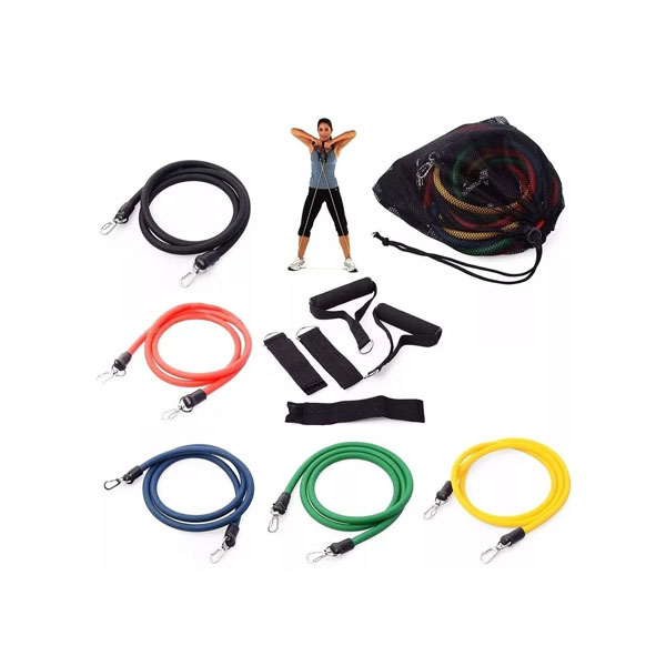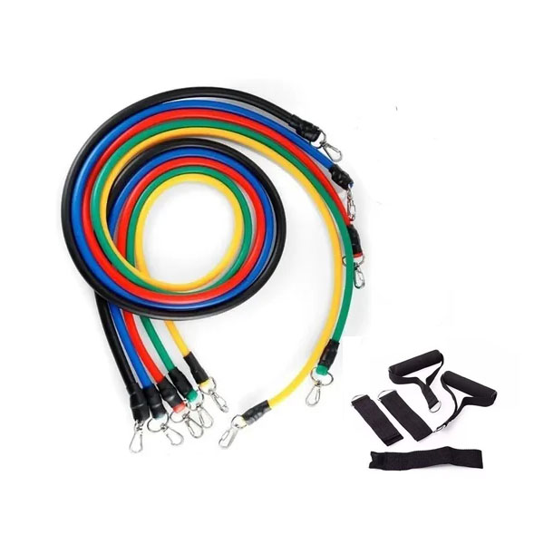 Pack de tubos elásticos de resistencia de 11 piezas, incluye 5 tubos de látex 100 % natural de calidad profesional+ accesorios, con resistencias de 4 a 10 kg y 1,2 m de longitud. Permiten hasta 30 combinaciones de carga, cuentan con mangos de espuma acolchada y mosquetones para mayor comodidad y seguridad. Ideales para entrenamiento muscular, kinesiología y uso deportivo, aptos para niños, adultos y adultos mayores, en trabajo individual o grupal.