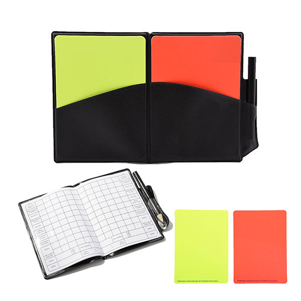 Contiene dos tarjetas ; una roja y otra amarilla, mas libreta de anotaciones y un lápiz. Medidas 9*12 Cms.
