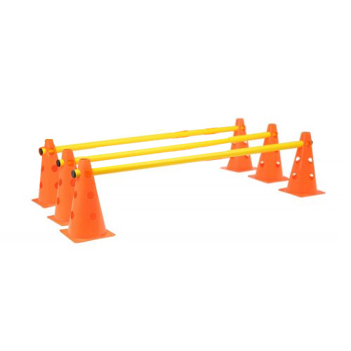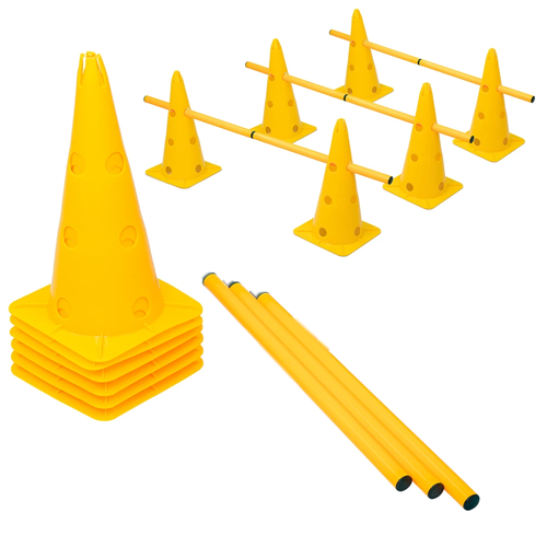 Kit de agilidad, cuenta con seis conos con orificios de 30 Cms de altura, más tres bastones plástico de 1 mt de largo según stock. Los conos son ranurado en la punta donde se puede poder también otro accesorio. Color según disponibilidad azul o amarillo.