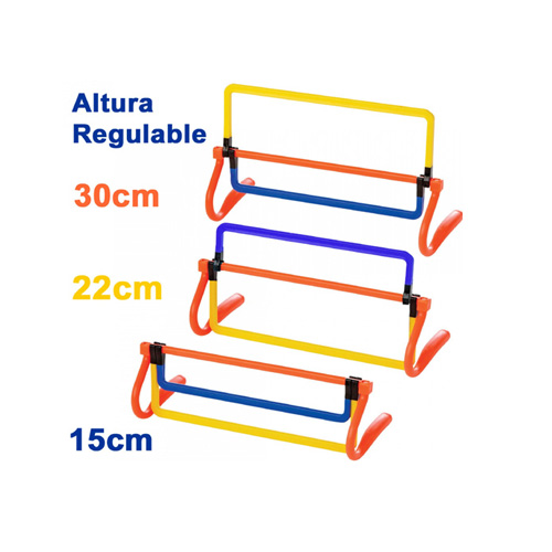 Mide de ancho 45 cms y se puede regular a 4 alturas 36 cms, 30 cms., 23 cms., y 15 cms. Liviana durable, cómoda de transportar. Colores según stock.Principalmente para trabajos de atletismo,fútbol y gimnasia. Actividades infantiles.